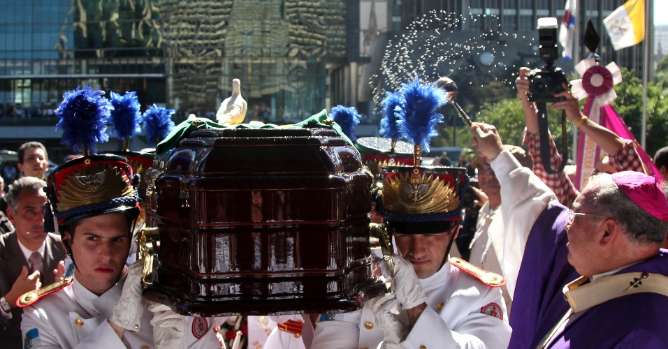 Imagem 33/50: 10.jul.2012 - Arcebispo do Rio de Janeiro, dom Orani João Tempesta, joga água benta em caixão do cardeal dom Eugênio Sales, que morreu aos 91 anos, vítima de um infarto enquanto dormia em sua casa, na zona norte do Rio de Janeiro MAIS Fernando Maia/UOL